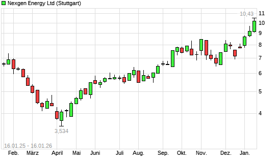 Mit dem Anstieg auf 10,20 EUR hat die Nexgen Energy-Aktie (ISIN CA65340P1062) am 15.01.2026 ein neues All-Time-High erreicht und damit den Kurs vom 14.01.2026 eingestellt.