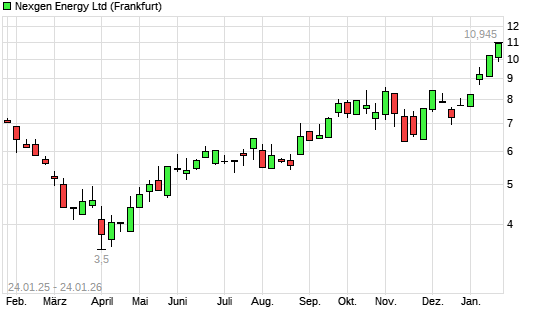 Mit dem Anstieg auf 10,94 EUR hat die Nexgen Energy-Aktie (ISIN CA65340P1062) am 23.01.2026 ein neues All-Time-High erreicht und damit den Kurs vom 21.01.2026 eingestellt.