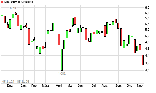 Mit dem Rücksetzer auf 4,43 EUR hat die Nexi-Aktie (ISIN IT0005366767) am 04.11.2025 ein neues 6-Monats-Tief erreicht und damit den Kurs vom 17.10.2025 eingestellt.