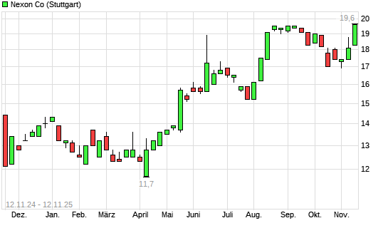 Mit dem Anstieg auf 19,60 EUR hat die Nexon-Aktie (ISIN JP3758190007) am 11.11.2025 ein neues 12-Monats-Hoch erreicht und damit den Kurs vom 22.08.2025 eingestellt.