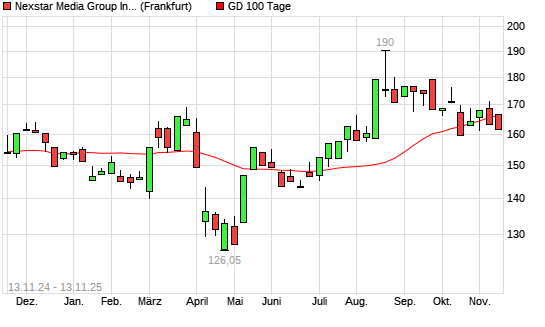 Mit dem Anstieg auf 166,45 EUR hat die Nexstar Broadcast Group-Aktie am 12.11.2025 die 100-Tage-Linie nach oben gekreuzt.