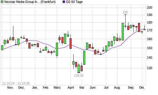 Mit dem Rücksetzer auf 171,30 EUR hat die Nexstar Broadcast Group-Aktie am 10.10.2025 die 50-Tage-Linie nach unten gekreuzt.