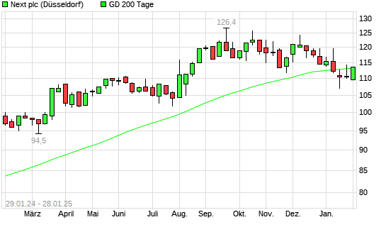 Mit dem Rücksetzer auf 110,10 EUR hat die Next-Aktie am 27.01.2025 die 200-Tage-Linie nach unten gekreuzt.