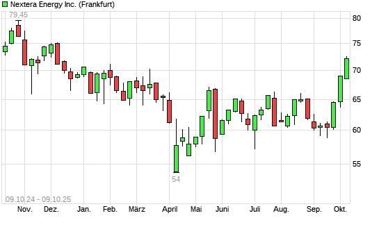 Mit dem Anstieg auf 72,55 EUR hat die NextEra Energy-Aktie (ISIN US65339F1012) am 08.10.2025 ein neues 6-Monats-Hoch erreicht und damit den Kurs vom 07.10.2025 eingestellt.