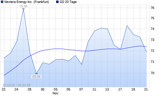 Mit dem Rücksetzer auf 71,89 EUR hat die NextEra Energy-Aktie am 21.11.2025 die 20-Tage-Linie nach unten gekreuzt.