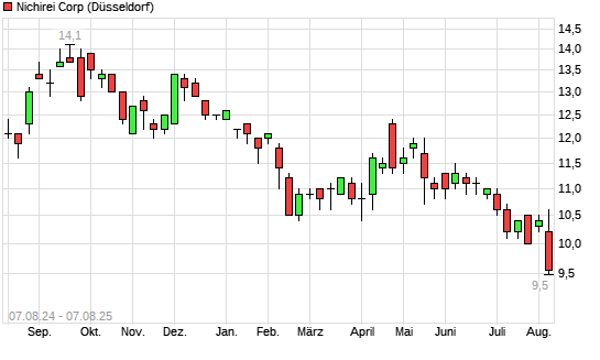 Mit dem Rücksetzer auf 9,80 EUR hat die Nichirei-Aktie (ISIN JP3665200006) am 06.08.2025 ein neues 12-Monats-Tief erreicht und damit den Kurs vom 22.07.2025 eingestellt.