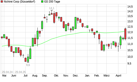 Mit dem Rücksetzer auf 11,60 EUR hat die Nichirei-Aktie am 24.04.2025 die 200-Tage-Linie nach unten gekreuzt.