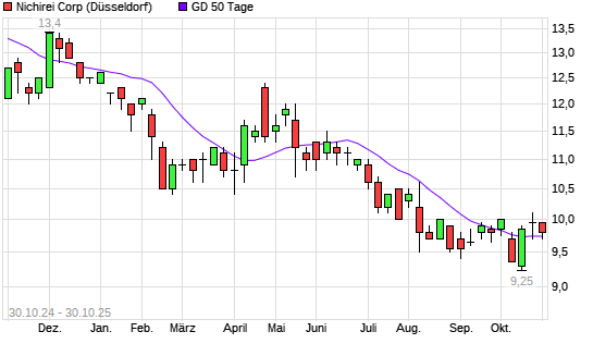 Mit dem Rücksetzer auf 9,75 EUR hat die Nichirei-Aktie am 29.10.2025 die 50-Tage-Linie nach unten gekreuzt.