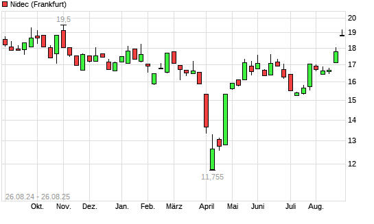 Mit dem Anstieg auf 19,19 EUR hat die Nidec-Aktie (ISIN JP3734800000) am 25.08.2025 ein neues 6-Monats-Hoch erreicht und damit den Kurs vom 19.08.2025 eingestellt.