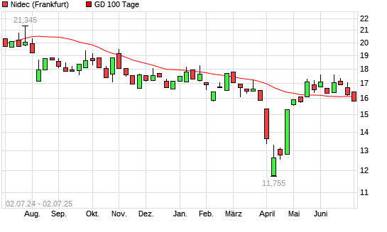 Mit dem Rücksetzer auf 16,05 EUR hat die Nidec-Aktie am 01.07.2025 die 100-Tage-Linie nach unten gekreuzt.