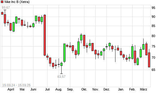 Mit dem Rücksetzer auf 65,93 EUR hat die Nike-Aktie (ISIN US6541061031) am 14.03.2025 ein neues 6-Monats-Tief erreicht und damit den Kurs vom 07.02.2025 eingestellt.