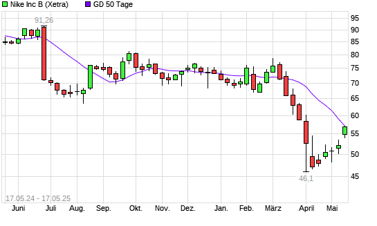 Mit dem Anstieg auf 56,83 EUR hat die Nike-Aktie am 16.05.2025 die 50-Tage-Linie nach oben gekreuzt.