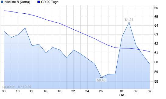 Mit dem Rücksetzer auf 60,94 EUR hat die Nike-Aktie am 06.10.2025 die 20-Tage-Linie nach unten gekreuzt.