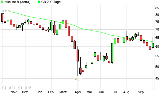 Mit dem Rücksetzer auf 62,17 EUR hat die Nike-Aktie am 03.10.2025 die 200-Tage-Linie nach unten gekreuzt.