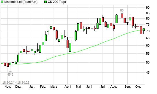 Mit dem Anstieg auf 71,94 EUR hat die Nintendo-Aktie am 17.10.2025 die 200-Tage-Linie nach oben gekreuzt.