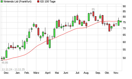 Mit dem Rücksetzer auf 75,58 EUR hat die Nintendo-Aktie am 10.11.2025 die 100-Tage-Linie nach unten gekreuzt.