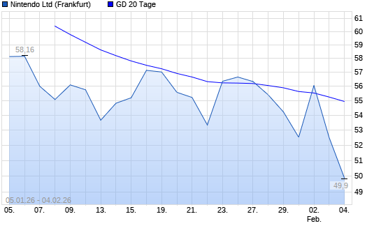 Mit dem Rücksetzer auf 52,50 EUR hat die Nintendo-Aktie am 03.02.2026 die 20-Tage-Linie nach unten gekreuzt.