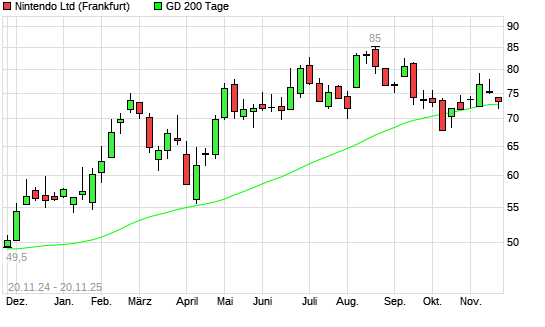 Mit dem Rücksetzer auf 72,04 EUR hat die Nintendo-Aktie am 19.11.2025 die 200-Tage-Linie nach unten gekreuzt.
