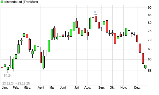 Mit dem Rücksetzer auf 56,96 EUR hat die Nintendo-Aktie (ISIN JP3756600007) am 22.12.2025 ein neues 6-Monats-Tief erreicht und damit den Kurs vom 19.12.2025 eingestellt.Die Nintendo-Aktie ...weiterlesen