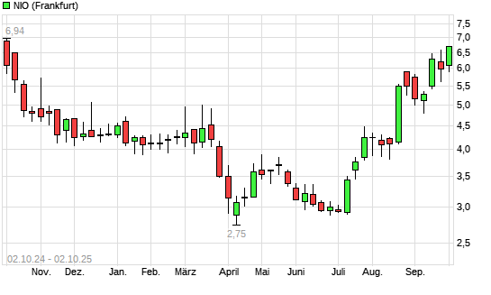 Mit dem Anstieg auf 6,51 EUR hat die Nio-Aktie (ISIN US62914V1061) am 01.10.2025 ein neues 12-Monats-Hoch erreicht und damit den Kurs vom 02.10.2024 eingestellt.