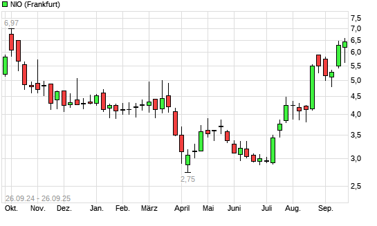 Mit dem Anstieg auf 6,35 EUR hat die Nio-Aktie (ISIN US62914V1061) am 25.09.2025 ein neues 6-Monats-Hoch erreicht und damit den Kurs vom 19.09.2025 eingestellt.