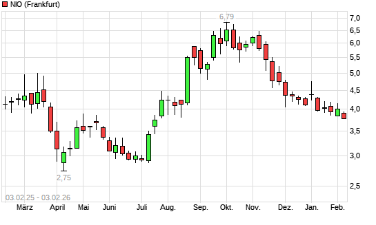Mit dem Rücksetzer auf 3,84 EUR hat die Nio-Aktie (ISIN US62914V1061) am 02.02.2026 ein neues 6-Monats-Tief erreicht und damit den Kurs vom 27.01.2026 eingestellt.Die Nio-Aktie befindet ...weiterlesen