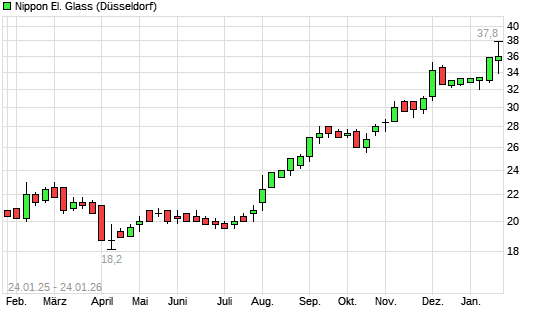 Mit dem Anstieg auf 37,60 EUR hat die Nippon Electric Glass-Aktie (ISIN JP3733400000) am 23.01.2026 ein neues 10-Jahres-Hoch erreicht und damit den Kurs vom 08.11.2017 eingestellt.