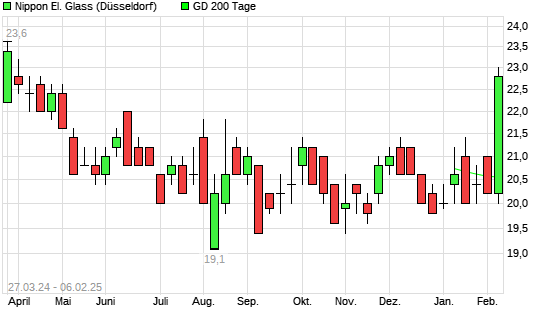 Mit dem Anstieg auf 23,00 EUR hat die Nippon Electric Glass-Aktie am 05.02.2025 die 200-Tage-Linie nach oben gekreuzt.