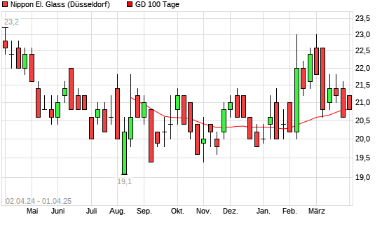 Mit dem Rücksetzer auf 21,00 EUR hat die Nippon Electric Glass-Aktie am 31.03.2025 die 100-Tage-Linie nach unten gekreuzt.