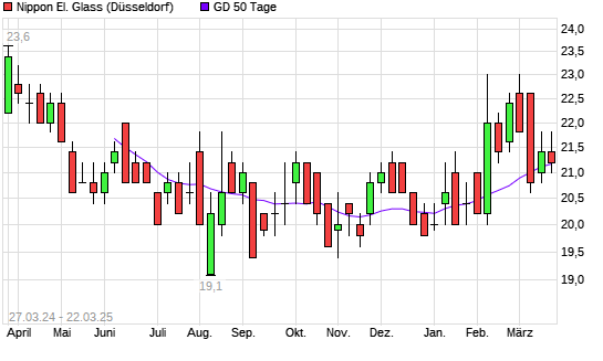 Mit dem Rücksetzer auf 21,40 EUR hat die Nippon Electric Glass-Aktie am 21.03.2025 die 50-Tage-Linie nach unten gekreuzt.