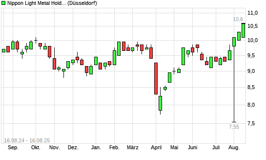 Mit dem Anstieg auf 10,80 EUR hat die Nippon Light Met. Holding-Aktie (ISIN JP3700200003) am 15.08.2025 ein neues 12-Monats-Hoch erreicht und damit den Kurs vom 14.08.2025 eingestellt.