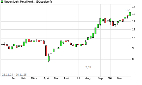 Mit dem Anstieg auf 13,00 EUR hat die Nippon Light Met. Holding-Aktie (ISIN JP3700200003) am 25.11.2025 ein neues 3-Jahres-Hoch erreicht und damit den Kurs vom 17.11.2025 eingestellt.