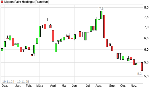 Mit dem Rücksetzer auf 5,25 EUR hat die Nippon Paint-Aktie (ISIN JP3749400002) am 18.11.2025 ein neues 12-Monats-Tief erreicht und damit den Kurs vom 30.10.2025 eingestellt.
