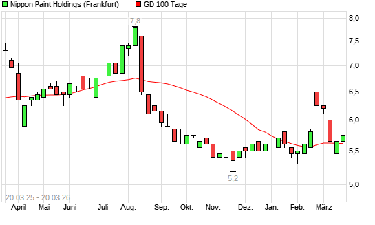Mit dem Anstieg auf 5,75 EUR hat die Nippon Paint-Aktie am 19.03.2026 die 100-Tage-Linie nach oben gekreuzt.
