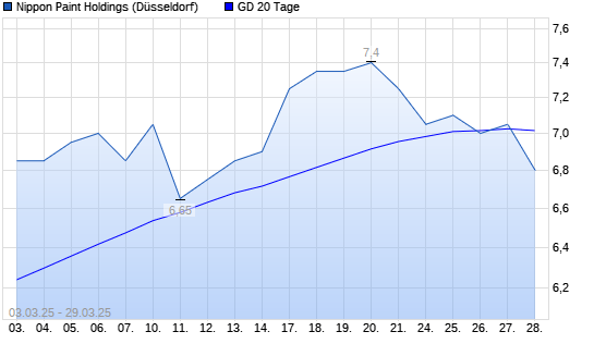 Mit dem Rücksetzer auf 6,95 EUR hat die Nippon Paint-Aktie am 28.03.2025 die 20-Tage-Linie nach unten gekreuzt.