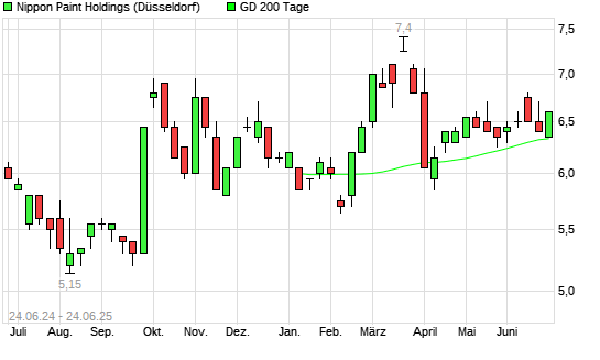 Mit dem Rücksetzer auf 6,40 EUR hat die Nippon Paint-Aktie am 23.06.2025 die 200-Tage-Linie nach unten gekreuzt.