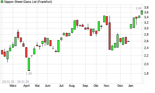 Mit dem Anstieg auf 3,66 EUR hat die Nippon Sheet Glass-Aktie (ISIN JP3686800008) am 28.01.2026 ein neues 12-Monats-Hoch erreicht und damit den Kurs vom 27.01.2026 eingestellt.