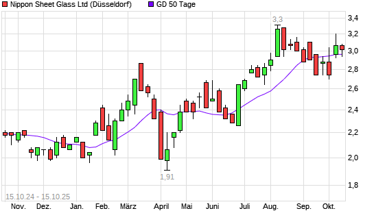 Mit dem Rücksetzer auf 2,98 EUR hat die Nippon Sheet Glass-Aktie am 14.10.2025 die 50-Tage-Linie nach unten gekreuzt.
