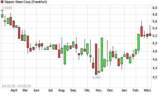 Mit dem Anstieg auf 21,93 EUR hat die Nippon Steel-Aktie (ISIN JP3381000003) am 03.03.2025 ein neues 6-Monats-Hoch erreicht und damit den Kurs vom 12.02.2025 eingestellt.
