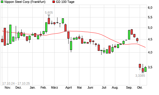 Mit dem Rücksetzer auf 3,39 EUR hat die Nippon Steel-Aktie am 16.10.2025 die 100-Tage-Linie nach unten gekreuzt.