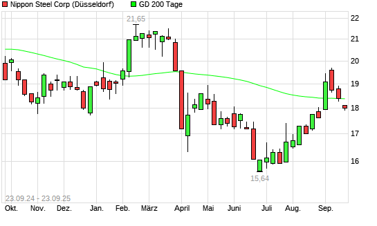 Mit dem Rücksetzer auf 18,12 EUR hat die Nippon Steel-Aktie am 22.09.2025 die 200-Tage-Linie nach unten gekreuzt.