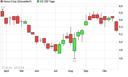 Mit dem Rücksetzer auf 5,35 EUR hat die Nippon Suisan Kaisha-Aktie am 23.10.2024 die 200-Tage-Linie nach unten gekreuzt.