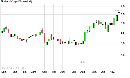 Mit dem Anstieg auf 6,65 EUR hat die Nippon Suisan Kaisha-Aktie (ISIN JP3718800000) am 17.11.2025 ein neues 5-Jahres-Hoch erreicht und damit den Kurs vom 14.11.2025 eingestellt.Die Nippon Suisan ...weiterlesen