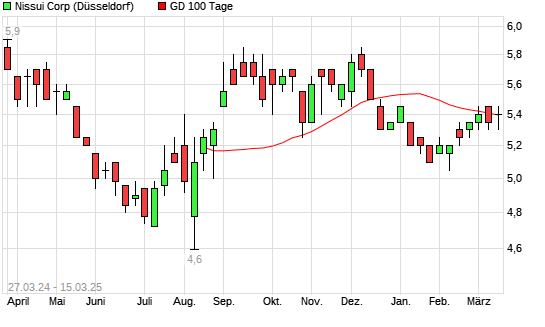 Mit dem Anstieg auf 5,45 EUR hat die Nippon Suisan Kaisha-Aktie am 14.03.2025 die 100-Tage-Linie nach oben gekreuzt.Die Nippon Suisan Kaisha-Aktie befindet sich seit dem 26.02.2025 im langfristigen ...weiterlesen