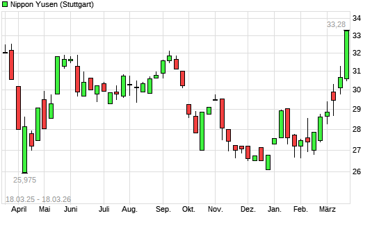 Mit dem Anstieg auf 31,88 EUR hat die Nippon Yusen-Aktie (ISIN JP3753000003) am 17.03.2026 ein neues 6-Monats-Hoch erreicht und damit den Kurs vom 12.03.2026 eingestellt.