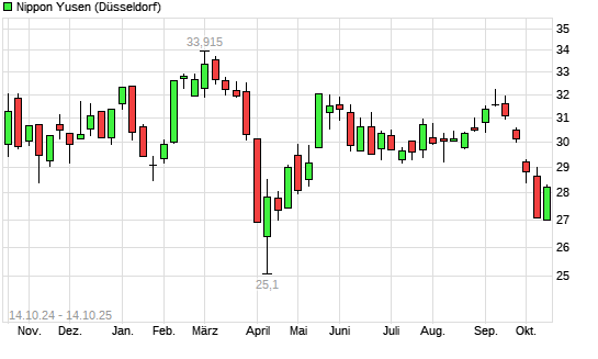 Mit dem Rücksetzer auf 26,88 EUR hat die Nippon Yusen-Aktie (ISIN JP3753000003) am 13.10.2025 ein neues 6-Monats-Tief erreicht und damit den Kurs vom 16.04.2025 eingestellt.