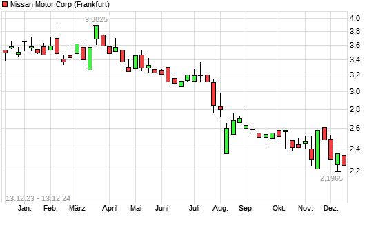 Mit dem Rücksetzer auf 2,20 EUR hat die Nissan Motor-Aktie (ISIN JP3672400003) am 12.12.2024 ein neues 10-Jahres-Tief erreicht und damit den Kurs vom 05.12.2024 eingestellt.