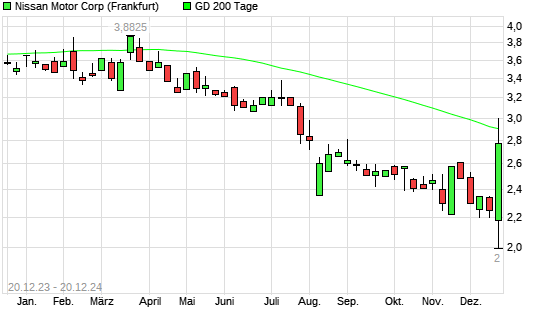 Mit dem Rücksetzer auf 2,77 EUR hat die Nissan Motor-Aktie am 19.12.2024 die 200-Tage-Linie nach unten gekreuzt.