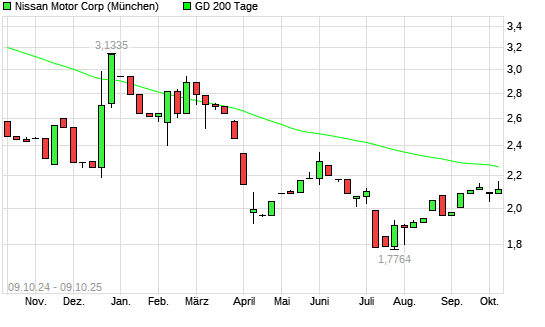 Mit dem Rücksetzer auf 2,10 EUR hat die Nissan Motor-Aktie am 08.10.2025 die 200-Tage-Linie nach unten gekreuzt.