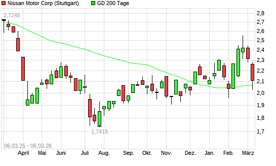 Mit dem Rücksetzer auf 2,03 EUR hat die Nissan Motor-Aktie am 05.03.2026 die 200-Tage-Linie nach unten gekreuzt.